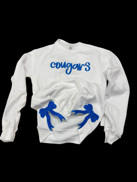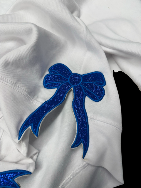 The viral side bow design with glitter applique and 3D/Puff embroidery! Available in the incredibly soft Bella Canvas Sweatshirt or the Bella Canvas long sleeve tee in all three colors (royal blue, white, black). Comfort Wash sweaters and Comfort Colors sweaters and long sleeve shirts are only available in black or white, also available in a black leopard print sweater.